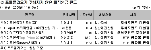‘현대와이즈퇴직연금채권혼합자’는 주식형 모펀드가 아직 설정되지 않았고, ‘SH TopsLife퇴직연금SRI채권혼합-자 2’는 주식 모펀드에 주식편입이 이뤄지지 않아 정상적인 운용이 되지 않고 있다.