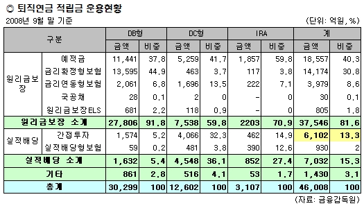 금융감독원의 집계에 따르면 2008년 9월말 현재 퇴직연금 가입근로자는 82만명, 적립금액은 4조 6,000억원에 달한다고 밝혀졌다. 퇴직연금 가입자는 매년 증가하고 있지만 아직까지 퇴직연금의 적립금액은 전체 퇴직금 적립금액(약 150조원)의 3% 수준에 그치고 있다.