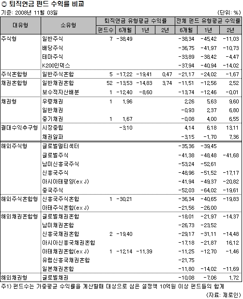 3년이 채 못되는 기간동안 퇴직연금 펀드의 성과가 어땠는지를 살펴보기 위해 전체 펀드의 유형평균 수익률과 비교해 보기로 했다. 유형평균 수익률은 설정액이 10억 이상인 펀드들을 대상으로 계산하는 만큼 일부 유형에서는 평균 수익률을 산정하지 않았다.