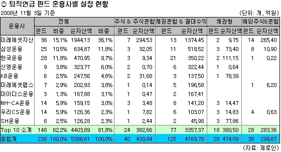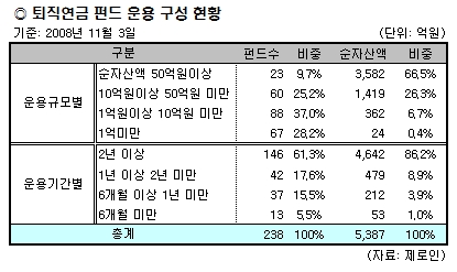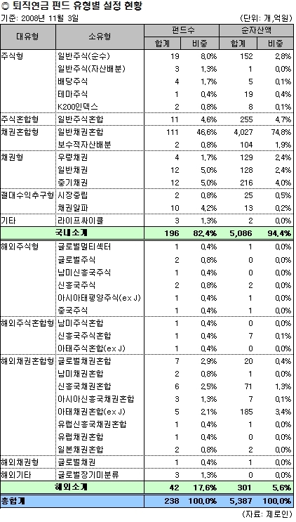 제로인이 집계한 2008년 10월 말 현재 퇴직연금 펀드의 규모는 총 238개(모펀드, 종류형 제외) 펀드로 전체 순자산 총액은 5,387억원이다.