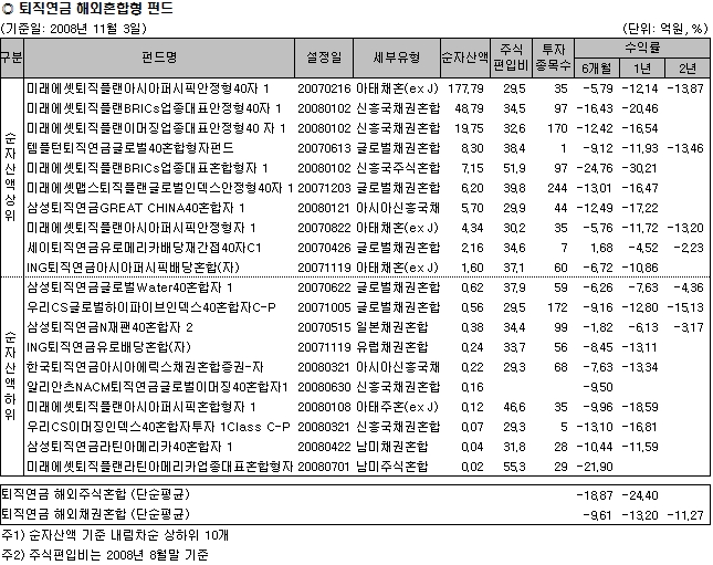 해외주식 및 국내외 채권에 분산 투자하는 해외혼합형 순자산액은 2008년 10월말 기준으로 295억원이며 퇴직연금 펀드 전체 순자산액의 5.5%를 차지하고 있다. 20개 설정 펀드 중 순자산액이 10억을 초과하는 펀드는 3개에 불과하다. 그러나 미미한 운용규모에도 불구하고 이 유형에 해당하는 모든 펀드들이 적정한 수준의 주식을 편입하고 있고, 투자 종목 수 역시 펀드에 투자하는 재간접 펀드를 제외하면 30개 이상의 종목에 투자하고 있는 것으로 나타났다.