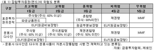 그러나 현재는 '표준투자권유준칙'에 제시된 금융투자 상품별 투자위험도 분류기준이 유일한 지침역할을 하고 있으나 분류방식이 구체적이지 않다는 한계를 지니고 있다. 자본시장법의 시행으로 운용업계는 각 회사의 상황에 맞게 투자설명서에 명기된 위험등급을 재부여하는 작업을 진행 중이다. 이르면 3월 또는 4월에는 투자자의 이해를 돕기 위해 변경된 투자위험등급을 포함한 투자설명서가 공시될 것으로 보인다. 이에 제로인은 펀드평가사로서 자본시장법 시행이전에 작성한 투자설명서 상의 투자위험등급 산정기준과 문제점을 살펴보고 대안을 고민해 보고자 한다.
