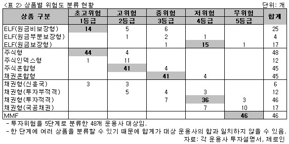 운용사들은 펀드의 투자위험등급을 주로 5개 계급구간으로 나누고 있으나 일부 운용사는 6개, 혹은 7개 구간을 가지는 등급체계를 갖고 있는 것으로 조사됐다. 대상 운용사 중 48개 운용사는 1등급(초고위험)에서 5등급(무위험)까지 구분하고 있으며, 6등급(마이다스운용, 유리운용) 또는 7등급(피델리티운용, 프랭클린템플턴운용)까지 세분화시킨 운용사도 있다. 6~7등급체계로 분류한 운용사는 투자지역(주식) 또는 신용등급(채권)에 따른 위험을 분류하기 위해 더 세분화된 위험등급을 사용하고 있다. 운용사마다 동일한 유형의 펀드를 운용하지 않기 때문에 세부적인 분류기준까지 일치하진 않지만, 큰 틀에서는 분류기준이 상당부분 일치하고 있다.