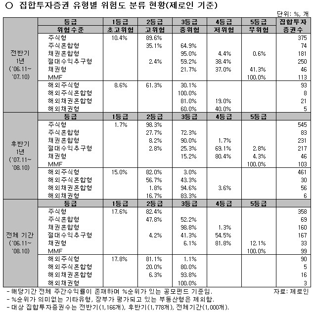 글로벌 금융위기가 시작되기 전인 과거 1년('06.11~'07.10) 기간을 분석한 결과 역시 최근 1년의 분석결과와 비슷한 패턴을 보이고 있다. 주식형의 경우 1등급과 2등급에 각각 10.4%, 89.6% 분포하여 고위험과 초고위험군에 집중되는 모습이며, 주식혼합형의 경우 2등급과 3등급에 각각 35.1%, 64.9% 분포하고 있다. 채권혼합형과 채권형은 3~5등급에 분포하고 있으며, MMF는 100% 모두 5등급을 부여 받았다. 주식형에 비해 채권형의 경우 최근 1년 동안의 높아진 신용위험도를 반영하여 전반적인 위험 등급 분포는 전반기 1년에 비해 하반기 1년에 상위등급 쪽으로 증가하는 추세를 보여주고 있다.