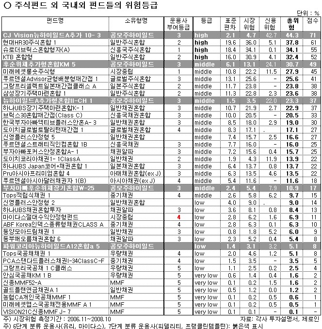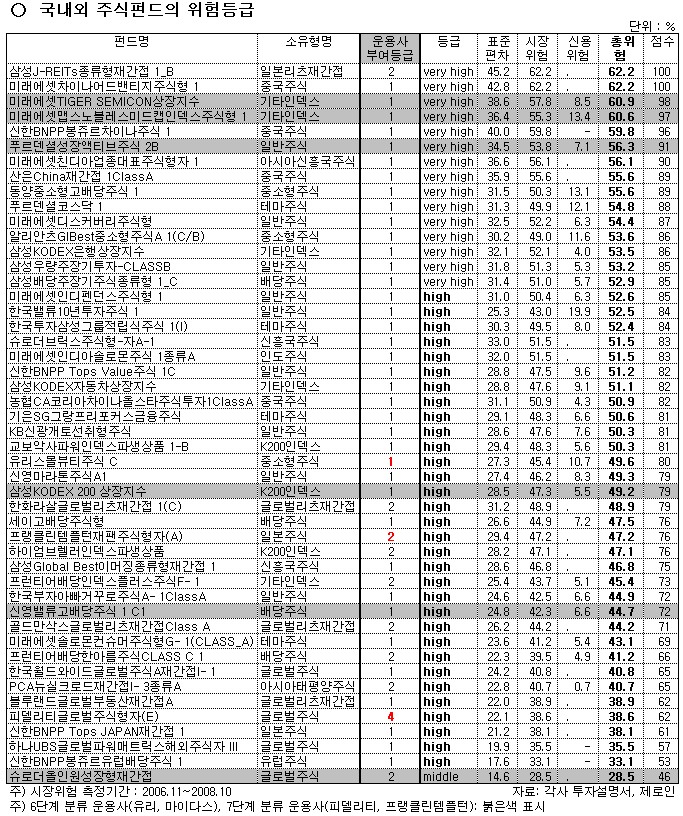 해외펀드 중에는 중국주식펀드인 미래에셋차이나어드밴티지주식형 1이 초고위험으로 분류됐으나 글로벌 주식펀드에 분산투하는 슈로더올인원성장형재간접은 중위험펀드로 분류돼 눈실을 끈다. 또 봉쥬르유럽배당주식1, TOPS JAPAN재간접1 등 선진국 주식에 투자하는 펀드들은 고위험으로 분류되더라도 상대적으로 총위험이 낮은 것으로 조사됐다.