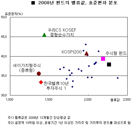 가치주 스타일 펀드는 낮은 수익률 변동성을 보인다고 알려져 있다. 하여 2008년 가치 표방펀드들의 표준편차를 조사해봤다.