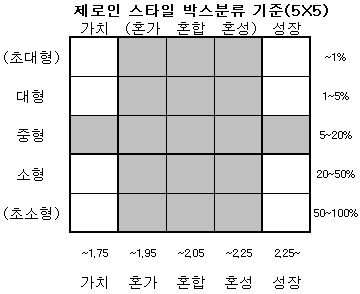 펀드가 보유한 주식의 스타일은 시가총액을 내림차순으로 정렬한 후 상위 5%에 해당하는종목까지를 대형주(상위 1%이내 초대형주), 5%에서 20%까지를 중형주, 20%초과 종목을 소형주(50~100% 초소형주)로 구분한다. 또 PER PBR를 시장평균값과 비교해 일정폭 이상 낮으면 가치주, 높으면 성장주로 구분한다. 상대PER, 상대PBR(이하 밸류값)는 시장평균과 비교하기 때문에 시장과 동일하다면 두 지표 값의 합은 2.0이 된다. 이에 따라 밸류 값을 기준으로 1.75이하는 가치주, 2.25초과는 성장주로 나누되 그 사이는 혼합주라고 칭한다. 그런데 혼합주에 속하는 펀드가 너무 많아 제로인은 이를 세분하고 있는데 밸류값이 1.75~1.95 사이를 혼합가치주, 2.05~2.25 사이를 혼합성장주라고 부른다.