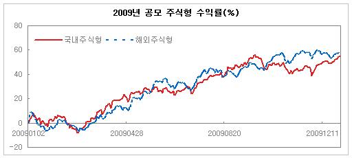 펀드평가사 제로인에 따르면 2009년 국내주식형과 해외주식형펀드의 연평균 수익률은 각각 54.44%와 58.21%를 기록했다.