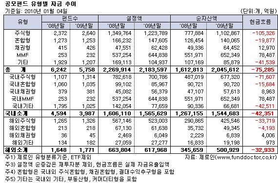 제로인 유형분류 기준에 따른 국내외(공모) 주식형펀드 설정액는 2008년말 134조 9,764억원에서 2009년말 122조 3,789억원으로 대폭 줄었다. 한 해 동안 12조원 넘게 쪼그라든 셈이다. 같은 기간 순유출액은 국내주식형에서는 7조, 해외주식형에서는 3조원 넘는 자금이 빠져나갔다.
