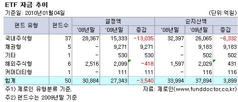 2006년부터 증가하기 시작해 순자산액은 2009년말 3조 7,894억원 수준으로 성장했다. 이는 시장개설 당시 3,500억원 수준보다 10배 이상 급성장한 것이다. 다양한 ETF신규 종목이 추가된데다 변동성이 높은 증시 상황이 지속됨에 따라 펀드 에 관심이 높아진 데 따른 것이다.