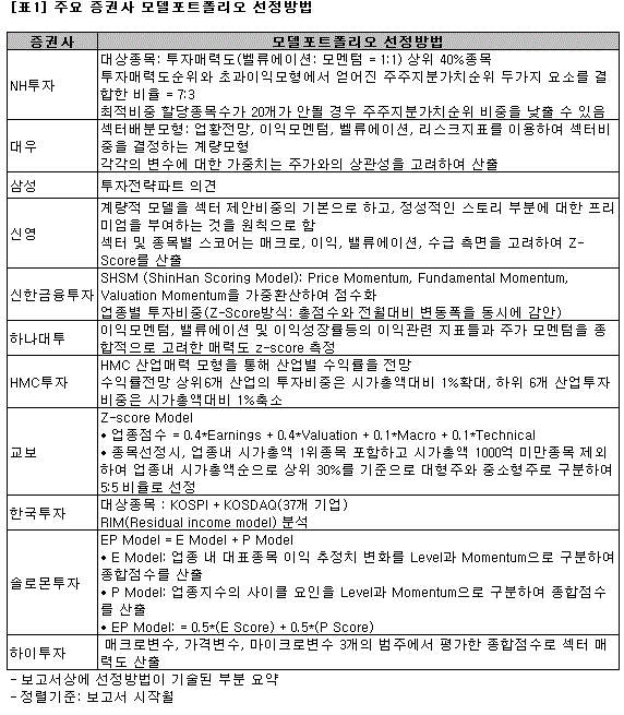 대부분의 증권사가 자체 개발한 모델을 이용해 종목 유니버스를 구성했다[표1]. NH투자증권은 순수하게 계량분석모델에만 의존해 모델포트폴리오를 구성한 반면, 삼성증권은 전적으로 투자전략파트의 의견을 반영했다. 시장과의 괴리를 고려해 업종 대표주나 시가총액이 큰 종목을 편입한 증권사도 있었다.