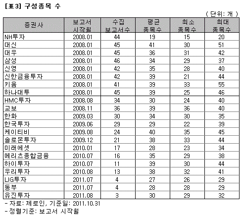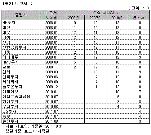2008년 1월부터 보고서가 수집된 증권사는 전체 21개 증권사 중 7개사다[표2]. 보고서를 수집하지 못했거나 해당 보고서상에 편입비중이 표기되지 않은 파일은 제외했다.