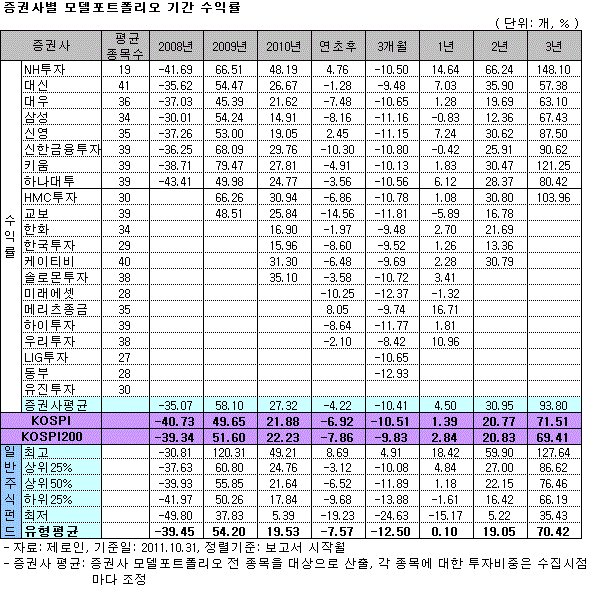 반면 동부증권(-12.93%)을 비롯해 미래에셋증권(-12.37%), 교보증권(-11.81%), 하이투자증권(-11.77%), 삼성증권(-11.16%) 등 14개 증권사의 3개월 모델포트폴리오 수익률은 같은 기간 코스피200지수 등락률(-9.83%)에 못 미쳤다.