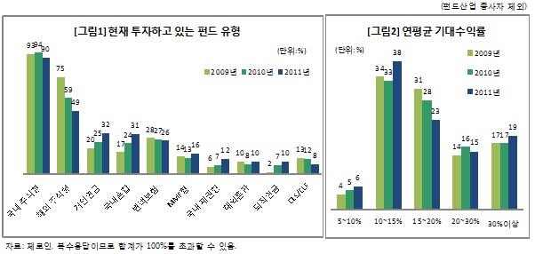 펀드에 대한 연 평균 기대수익률은 전반적으로 낮아졌다. 작년 국내 증시가 10% 이상 뒷걸음질치면서 대부분의 펀드가 마이너스 성과를 기록했고, 유럽 재정위기 등 글로벌 악재가 올해까지 이어지면서 펀드 수익률에 대한 투자자들의 기대치가 낮아진 것으로 풀이된다.