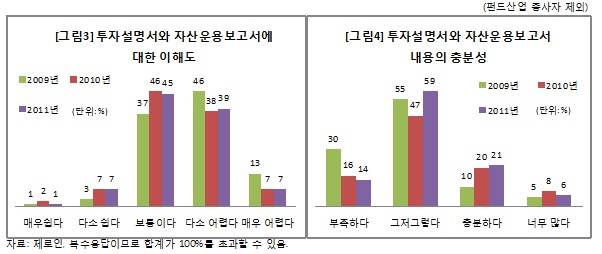 투자설명서와 자산운용보고서의 난이도와 내용에 대한 투자자들의 만족도는 높지 않았다. 하지만 전년에 비해서는 개선되는 모습을 보였다. 투자설명서와 자산운용보고서에 대해 '다소 어렵다(39%)'거나 '매우 어렵다(7%)'라고 답한 응답자가 46%로 절반 가까이 됐다. 어렵다고 답한 응답자 비중은 2009년 59%에서 2010년 45% 정도로 크게 낮아진 뒤 올해에도 비슷한 비중을 유지했다.
