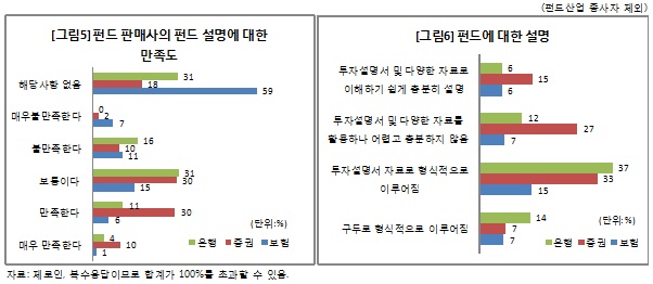 펀드판매사의 펀드 설명에 대한 만족도 설문 결과 증권사에 대한 만족도가 보통 이상인 응답자 비중은 70%로 높게 나타났다. '불만족한다'나 '매우 불만족한다'고 답한 응답자는 12%에 불과했다. 반면 은행에 대해서는 보통 이상이 46%로 증권사보다 낮았다. 대신 '불만족한다'는 응답자는 16%로 증권보다 높았다. 보험사는 '해당사항 없음'이라고 답한 응답자가 59%로 가장 높아 투자자들이 보험사를 통해 펀드에 가입하는 경우는 많지 않은 것으로 집계됐다.