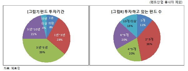 펀드 투자기간을 묻는 질문에서는 투자기간이 3년 이상이라고 밝힌 투자자가 60%를 넘어, 대부분의 펀드 투자자가 3년 이상 펀드를 장기 보유하고 있는 것으로 집계됐다. 또한 50% 이상의 응답자가 4개 이상 펀드에 투자하고 있다고 밝히는 등 여러 개의 펀드에 분산 투자하고 있는 투자자들이 많았다.