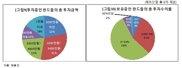펀드의 총 투자금액은 1000만~3000만원이 31%로 가장 높은 비중을 차지했다. 보유중인 펀드의 총 투자수익률은 0~20%가 56%로 가장 많았다.
