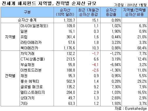 헤지펀드는 주식, 파생상품, 통화, 원자재 등 신속하게 거래될 수 있는 고위험 자산들에 주로 투자한다. 투자처를 다변화한 균형잡힌 분산투자를 통해 일방향 투자로 나타날 수 있는 손실 리스크를 줄이고 있다. 전략이 포괄적이며 액티브한 만큼 대개 사모펀드로 출시되어 운용규제를 피하고 있다. 글로벌 헤지펀드 조사기관인 ‘Eurekahedge’ 자료에 의하면, 전세계 헤지펀드 순자산 규모는 2011년 1월말 기준 약 1조7,000억 달러(1,900조원)이며, 주식 롱숏(29.4%), 멀티전략(16.5%), CTA/Managered Futures(12.1%), 이벤트드리븐(11.2%) 순으로 전략활용비중이 높다. 지역별로는 미국, 유럽 등 선진국 헤지펀드 시장이 전체의 90% 가량을 차지하는데, 이들 국가들은 헤지펀드 시장이 발달한 만큼 공모펀드 규모도 상당하다.