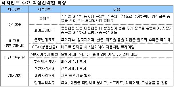 국내 헤지펀드 시장은 운용여건과 운용사들의 기반이 정착단계에 있어, 현재 대부분이 롱숏전략을 주로 활용하고 있다. 롱숏전략은 오를 만한 종목을 매수하면서 동시에 하락이 예상되는 종목을 공매도(short Selling)하여 차익을 추구하는 전략이다. 국내에서는 예탁원 등에서 주식을 빌려 매도하는 차입 공매도(Covered short selling)만 허용되며, 선진국에서 사용되는 무차입 공매도(Naked short selling)는 허용되지 않고 있다. 또 다른 롱숏전략 개념인 페어트레이딩(Pair Trading)의 경우, 유사한 주가흐름이나 상관관계가 높은 두 종목을 비교해 고평가 종목을 매도하고 저평가 종목을 매수하는 방식이다. 같은 업종 내 비슷한 사업구조를 갖거나, 이종업종이더라도 상관관계가 높다면 페어가 되며, 유동성이 풍부한 시가총액 상위 종목군들이 적극 활용되고 있다.