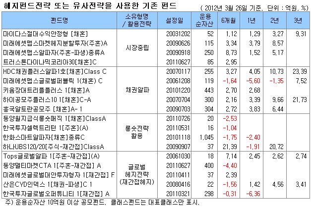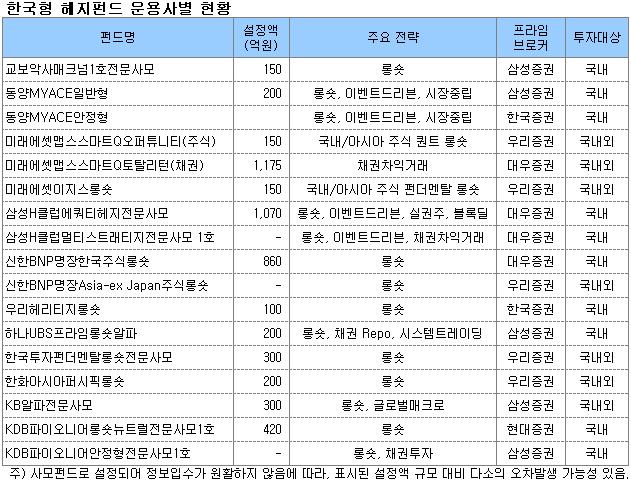이미 헤지펀드 전략을 사용하고 있는 국내 펀드들도 있다. 현선물차익거래, 공모주투자, 롱숏 등을 활용한 절대수익추구형이나 차입을 통한 공매도를 통해 레버리지 투자효과를 노리는 레버리지펀드(120/20) 등이 다. 한국형 헤지펀드에서 적용되는 순수 헤지펀드 운용 약관이나 규정, 전략에 기인하지는 않지만, 헤지펀드 운용에 사용되는 일부 전략을 가미하여 절대수익을 추구를 목표로 한 펀드들이다. 그 중 키움자산운용은 절대수익형 펀드를 통해, 롱숏전략 뿐만 아니라, 해외 공모주와 블록딜 투자 등 헤지펀드 전략을 적극 활용하고 있다. 트러스톤자산운용도 싱가포르 현지법인을 통해 약 2년간 역외 헤지펀드를 운용(700억원 수준)하고 있으며, 국내 사모펀드를 통해 롱숏전략을 활용하고 있다. 이들 운용사들은 언제든지 국내시장에서도 활동영역을 넓혀갈 수 있을 것으로 기대된다.