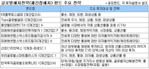 최근에는 역외 헤지펀드와 관련 선물인덱스에 분산 투자되는 글로벌헤지전략펀드가 주목을 받기도 했다. 글로벌헤지전략펀드는 5~10개의 역외 헤지펀드와 상품선물에 재간접 형태로 투자되는데, CTA(Commodity Trading Advisors)전략을 포함한 멀티전략이 사용되는 만큼, 전세계 헤지펀드 전략을 잘 반영하고 있다. CTA 전략은 주가지수, 환율, 원자재 등 선물거래를 통해 이루어지는 매크로 전략을 시스템화하여 거래하게 되며 액티브한 방향성 매매가 뒷받침된다. 일부 공모펀드가 출시돼 관심을 끌었으나, 아직까지는 펀드 대부분 운용성과와 수탁고 흐름이 양호하지 못한 가운데, 헤지펀드 개념에 대한 개인투자자들의 인지도가 약한 편이다.