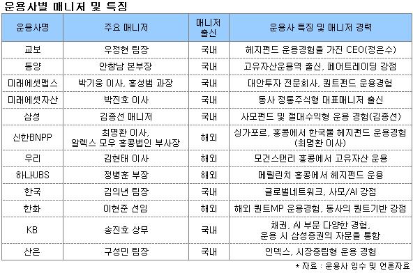 미래에셋운용의 헤지펀드를 총괄하는 박진호 이사는 10여년간 ‘미래에셋디스커버리’, ‘미래에셋인디펜던스’ 등 대표 주식형펀드를 총괄해 온 정통 매니저 출신이다. 미래에셋맵스운용의 박기웅 이사와 홍성범 과장은 절대수익형 운용경험이 있으며, 회사의 탄탄한 퀀트 모델의 지원을 받고 있다. 동양운용의 안창남 본부장은 페어트레이딩과 이벤트드리븐 부문의 경험이 풍부한 것이 장점이다. 삼성운용의 김종선 매니저는 사모펀드와 절대수익형 펀드를 운용한 바 있으며, 회사의 강점인 퀀트 부문과 전략부서를 통한 자산배분 기반도 자리잡고 있다. 한국운용의 김의년 헤지펀드팀장은 동사 채권 및 해외 운용역 출신으로서, 재간접헤지펀드 규모(5,100억원, 운용사전체 9,700억원)가 상당하고, 글로벌 운용과 리서치와 사모펀드 부문의 강점을 가지고 있는 한국운용의 노하우가 기대된다.