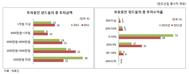 펀드에 투자하는 자금의 규모는 전년대비 줄었다. 현재 투자하는 펀드들의 총투자금액으로는 1000만원 미만이 가장 높은 비중을 차지하여 전년도 1000~3000만원 대비 투자금액이 감소한 것을 볼 수 있었다. 1000만원 미만은 36%의 응답자로 전년대비 14%포인트 증가했다. 반면, 1000~3000만원은 7%포인트 감소한 24%의 응답자가 대답했고, 6천만원이상의 고액투자자들도 전년대비 5%포인트 감소한 21%를 기록했다. 이 밖에도 3000~6000만원(19%), 6000~1억원(8%)의 투자자들도 각각 2%포인트 감소했다.
