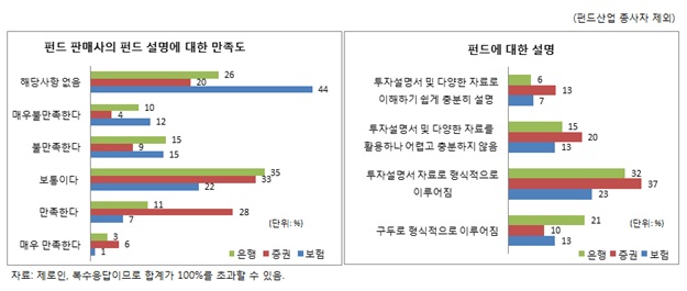 펀드에 대한 설명 설문조사 결과 ‘투자설명서 자료로 형식적으로 이루어짐’이나 ‘투자설명서 및 다양한 자료를 활용하나 어렵고 충분하지 않음’이라고 답한 응답자는 증권사가 각각 37%, 20% 로 가장 높았다. 반면 ‘투자설명서 및 다양한 자료로 이해하기 쉽게 충분히 설명’했다고 생각한 응답자도 증권사가(13%) 가장 높게 나타났고 ‘구두로 형식적으로 이루어짐’이라고 생각한 응답자는 은행(21%)의 비중이 가장 컸다.