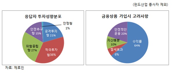 금융상품 투자시 고려하는 사항으로 응답자의 64%가 수익률이라고 답했고, 뒤를 이어 20%의 투자자가 ‘안정적인 운용’이라고 대답했다.