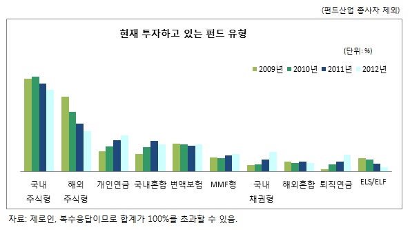 금융시장의 변동성 확대 등으로 안전자산에 대한 관심은 지속적으로 나타났다. 주식형 및 혼합형 펀드 투자자는 감소한 반면, 개인연금이나 퇴직연금 펀드투자자는 소폭 증가했다. 현재 국내 주식형 펀드에 투자하고 있는 응답자는 74%로 전년대비 16%포인트 감소했고, 해외주식형 펀드 역시 36%로 전년에 비해 13%포인트나 감소했다. 반면, 개인연금 투자자는 32%에서 33%로 전년대비 비슷한 결과를 보여줬고 국내채권형과 MMF는 각각 17%, 18%로 전년 대비 5%포인트, 2%포인트 늘었다.