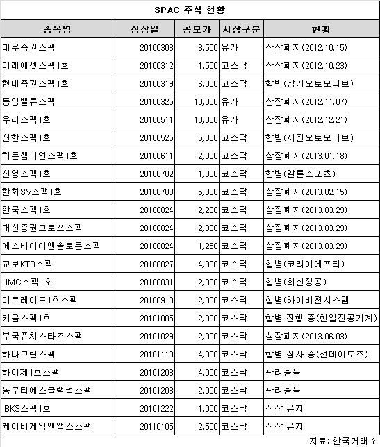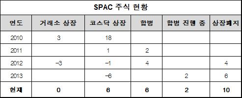 3년이 지난 현재 국내 주식시장에서 합병 성공한 SPAC은 6개에 불과하다. 키움스팩1호는 현재 합병 진행 중이고, 하나그린스팩은 합병 심사 절차에 들어가면서 현재 거래 정지 상태이다. 22개 SPAC 주식 가운데 10개가 상장폐지 되었다. 거래소에 상장된 3개 SPAC주식은 모두 상장폐지되었고, 현재 코스닥에 상장된6개(관리종목 2개) SPAC주식만 시장에 남아있는 상황이다. 2011년 1월 케이비게임앤앱스스팩이 마직막으로 상장되었고, 그 후 추가 상장은 없었다.