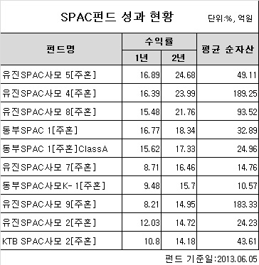 2013년 6월 5일 기준으로 평균 순자산 10억원 이상인 스팩펀드 성과를 조사한 결과, 펀드의 1년, 2년 수익률이 양호한 것으로 나타났다. ‘유진SPAC사모 5[주혼]’펀드는 2년 수익률 24.68%로 가장 우수한 것으로 나타났다. 사모펀드 외에 ‘동부SPAC 1[주혼]ClassA’ 공모펀드의 2년 수익률도 17.33%로 선방했다. 일부 스팩펀드가 마이너스의 성과를 기록했으나, 대부분 펀드들이 양호한 성과를 기록하면서 시장 대비 선방했다.