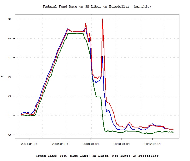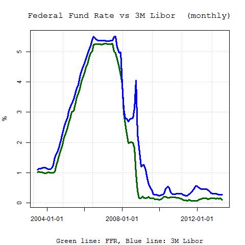 연방기금금리(이하 FFR)는 은행간의 초단기 금리로 정책금리의 목표금리가 된다. FFR은 시장에서 결정되며 미국연방준비은행이 시장개입을 통해 유동성을 공급하고 줄이면서 금리를 조절한다. 서브프라임 모기지 사태 이전에 일부에서 리보를 일종의 이론적인 무위험 금리로 보기도 했다. FFR과 리보 금리간에 일정한 범위의 스프레드가 있었다. 2004년부터 금리변화가 없을 때, 10bp 내외, 금리 상승 구간에선 30bp 내외의 스프레드를 보였다. 금융위기로 인한 신용경색 이후부터는 스프레드가 100bp 이상의 등락하며 요동쳤다. 리보에는 시중 은행의 유동성과 신용도가 반영된다는 것을 알 수 있다.