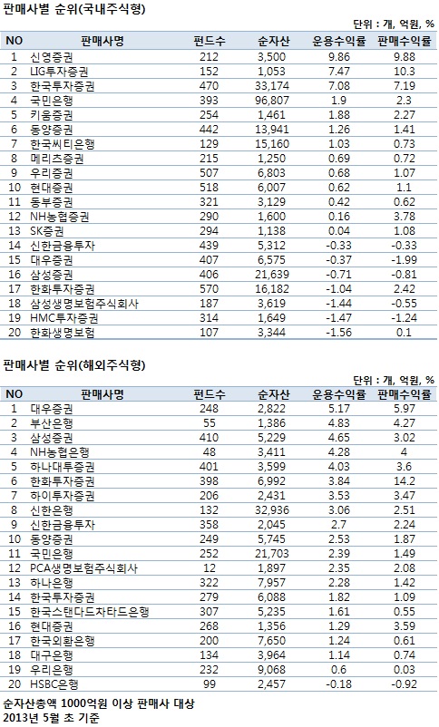 국내주식형 펀드의 운용수익률 기준으로 보면 신영증권이 9.86%의 성과를 보이며 가장 높은 수익률을 기록했다. 뒤를 이어 LIG투자증권이 7.47%, 한국투자증권이 7.08%의 수익률을 기록했다. 판매수익률 부부만 고려하면 LIG투자증권으로 1년간 10.3%로 가장 높은 성과를 기록했으며 신영증권이, 9.88%, 한국투자증권이 7.19%의 성과로 뒤를 이었다. 위 세개의 판매사는 운용수익률과 판매수익률 두 부문에서 모두 상위권에 자리했다. 반면 HSBC은행, 유진투자증권, PCA생명은 상대적인 약세를 나타냈다.