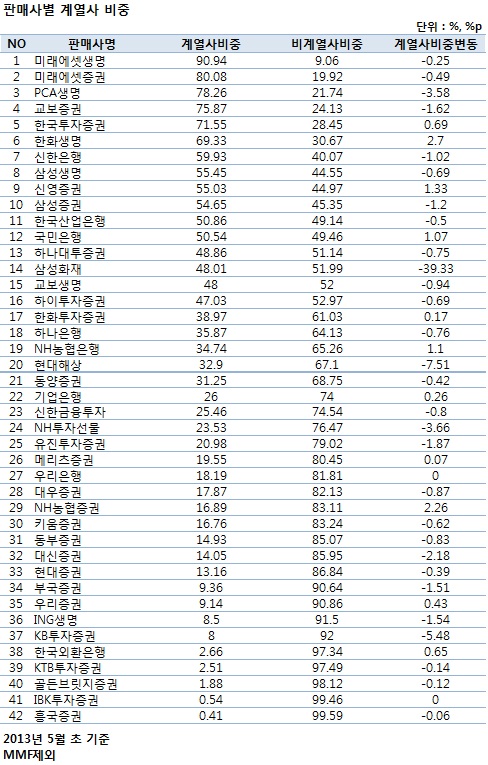 펀드 판매사간 계열사비중 자료를 보면 5월 초 기준으로 약 70개의 판매사 중, 계열사를 보유한 판매사는 42개로 집계됐다. 이 중 계열사 상한 비중인 50%를 초과한 판매사는 12개였고 미래에셋생명, 한국투자증권, 신한은행, 삼성증권, 국민은행과 같은 대형사가 다수 자리했다. 대부분의 판매사가 전월 대비 계열사 비중이 감소하는 모습을 보였으나 특정 판매사의 경우는 전월 대비 판매 비중이 오히려 증가한 곳도 있었다.