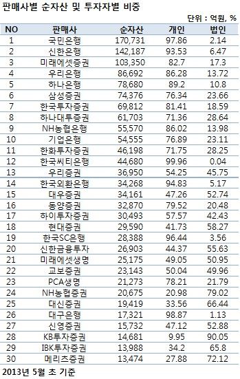 아래 표는 판매사의 펀드 수탁고를 개인과 법인으로 구분한 자료다. 약 70여개의 판매사 중 자금규모 상위 30개의 판매사를 기준으로 추렸다. 이 중 국민은행의 순자산 총액이17조 731억원으로 가장 높았으며 판매사 전체 수탁고의 약 1/10 비중을 나타냈다. 투자자별 비중으로는 개인이 97.86%, 법인이 2.14%로 집계됐다. 뒤를 이어 신한은행과 미래에셋이 각각 10조 이상의 수탁고를 보이며 순자산총액 상위에 자리했고 개인비중이 법인비중에 비해 상대적으로 높았다.
