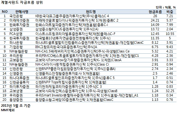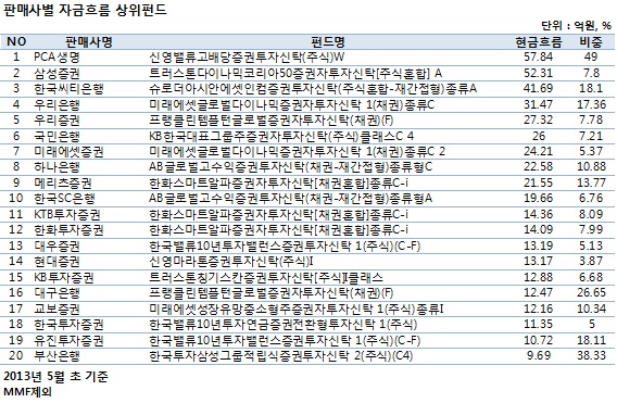 판매사별로 2013년 4월 한 달간의 자금흐름 증감을 살펴본 결과 PCA생명이 ‘신영밸류고배당(주식)W’ 클래스 펀드가 57억원 이상 자금이 유입되며 가장 높은 상승폭을 보였다. 이는 5월 초 기준 PCA생명의 전체 자금흐름 증감액 중 49%에 해당하는 금액이다. 뒤를 이어 삼성증권이 ‘트러스톤다이나믹코리아50(주식혼합)A’ 클래스 펀드를 52.31억원 매수했고 전체 상승분 대비 7.8%의 비중을 기록했다.