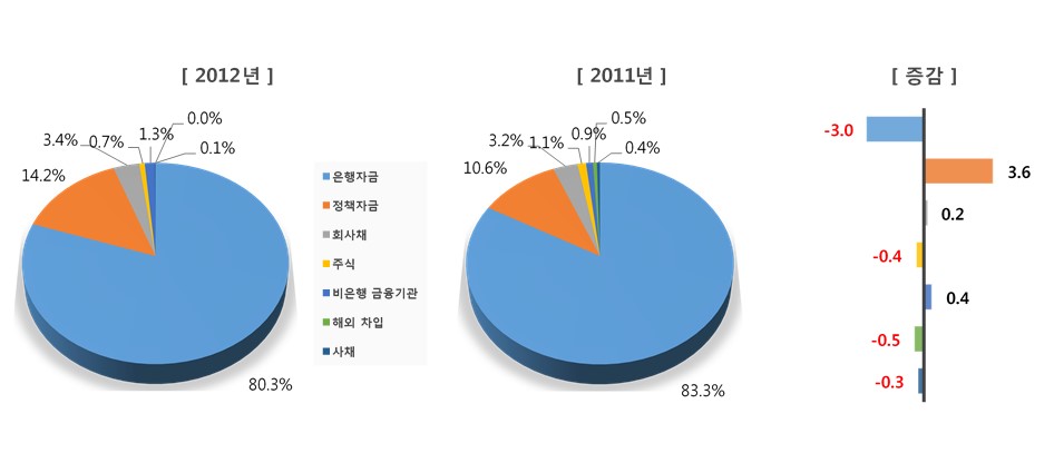 2012년 중소기업의 외부자금 조달형태를 살펴보면, ‘은행자금’이 80.3%로 2011년 대비 3.0%p 감소했고 ‘정책자금’은 3.6% 상승했지만, 여전히 ‘은행자금’ 의존율이 높은 비중을 차지하고 있다.