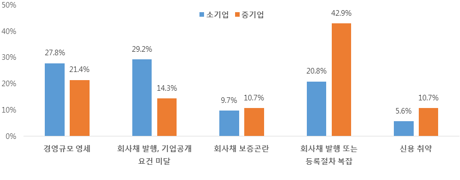 직접금융(주식 및 회사채)을 통해 자금 조달하는 중소기업은 전체 중소기업의 4.1%로 미미한 수준이다. 이러한 이유로는 ‘회사채 발행 및 등록절차 복잡’(27.0%), ‘경영규모 영세’(26.0%) 등으로 직접금융을 통한 자금조달에 어려움을 호소하고 있다.
