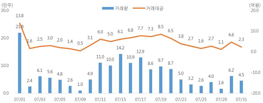 7월 말 기준으로 코넥스시장의 누적 거래대금은 약 100억원에 달했다. 7월 한달 간 일평균 거래량은 7만 1천주이며, 일평균 거래대금은 4억 4천만원이었다. 이는 1996년 출범한 코스닥시장과 2005년 7월에 출범한 프리보드시장과 비교하면 코넥스시장의 첫 한 달은 양호한 편이다. (코스닥 8만 7천주, 17억 6천만원, 프리보드 10만 1천주, 4천 3백만원)