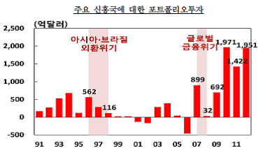 이에 글로벌금융위기 이후 글로벌유동성이 크게 확대되었으며, 선진국 금융시장의 불안정성이 심화되고, 저금리 기조로 인해 투자수익률이 악화되면서 신흥국 금융시장에 대한 투자가 급증하였다. 또한, 급격한 투자자본의 유입으로 신흥국들의 통화가치가 절상되면서 환차익에 대한 기대까지 더해져 신흥국에 대한 투자는 더욱 증대되었다. 실제 2010년부터 2012년까지 주요 신흥국들에 대한 포트폴리오 투자는 2007년의 2배 수준인 연평균 1,553억달러로 대폭 확대되었고, 전세계 금융시장에서 신흥국 시장이 차지하는 비중도 2005년 2%에서 2012년 11%까지 상승하였다.