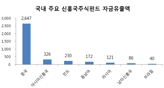 한편, 국내 펀드시장의 신흥국펀드들도 자금유출 및 수익률 악화에 고전하고 있다. 9월 5일 기준 직전 1달 동안 해외주식형펀드 전체의 설정액은 4,134억원 감소하였으며, 이 중 중국펀드의 이탈 자금은 2,647억원으로 전체 유출액의 절반을 차지하고 있다. 더불어 아시아신흥국주식, 인도, 동남아 펀드에서도 각각 300억원, 230억원, 172억원이 유출되었으며 러시아, 남미신흥국, 브라질펀드에서도 각각 121억원, 86억원, 40억원이 이탈했다. 수익률 측면에서도 동 기간 동안 인도펀드는 -16.09%를 기록하여 해외주식형펀드 중 가장 저조했고, 동남아펀드(-9.16%), 남미신흥국펀드(-4.66%), 아시아신흥국펀드(-4.46%), 브라질펀드(-3.52%) 등도 해외펀드 중 최하위권의 수익률을 나타냈다. 신흥국채권펀드도 주식펀드와 비슷한 양상을 나타내어 신흥국채권펀드에서 6월 3,210억원, 7월 1,277억원, 8월 950억원 등 3개월 동안 총 5,437억원의 자금이 이탈하였다.