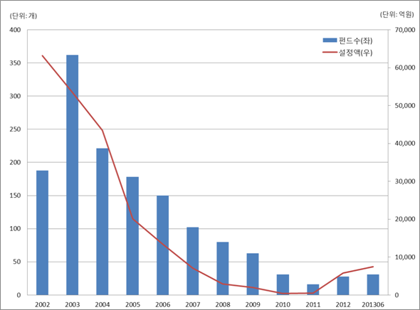 국내 하이일드 펀드는 설정액 기준으로 2002년말 6조원에서 2010년말 4백억원으로 99% 이상 급감하고, 이 시기 동안 연평균 40% 이상의 감소율을 보였다. 하이일드 펀드의 수 또한 매년 지속적인 감소세를 보이며 2011년 말에는 16개를 기록했다. 하지만 최근 고수익∙고위험을 추구하는 하이일드 펀드로 대규모 자금이 유입되면서 2013년 6월말 기준 국내 하이일드 펀드의 설정액은 7,476억원으로 6년 6개월만에 7천억원을 상회했다. 이는 하이일드 펀드가 가장 침체되었던 2010년말 대비 18배 이상 증가한 수치이다.