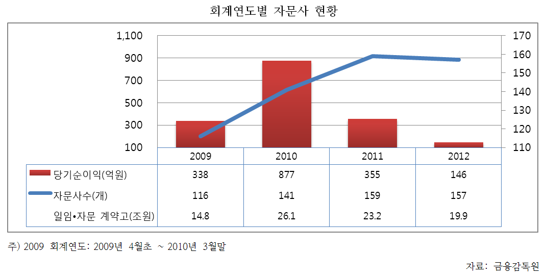 투자심리가 얼어붙으면서 계약고도 감소했고, 시장 진입 조건이 완화되면서 자문사 수가 크게 늘어 경쟁이 심해진 것도 수익성 악화의 직접적인 원인이 되었다. 현재 약 60% 이상의 자문사가 적자를 기록하고 있을 정도이다.