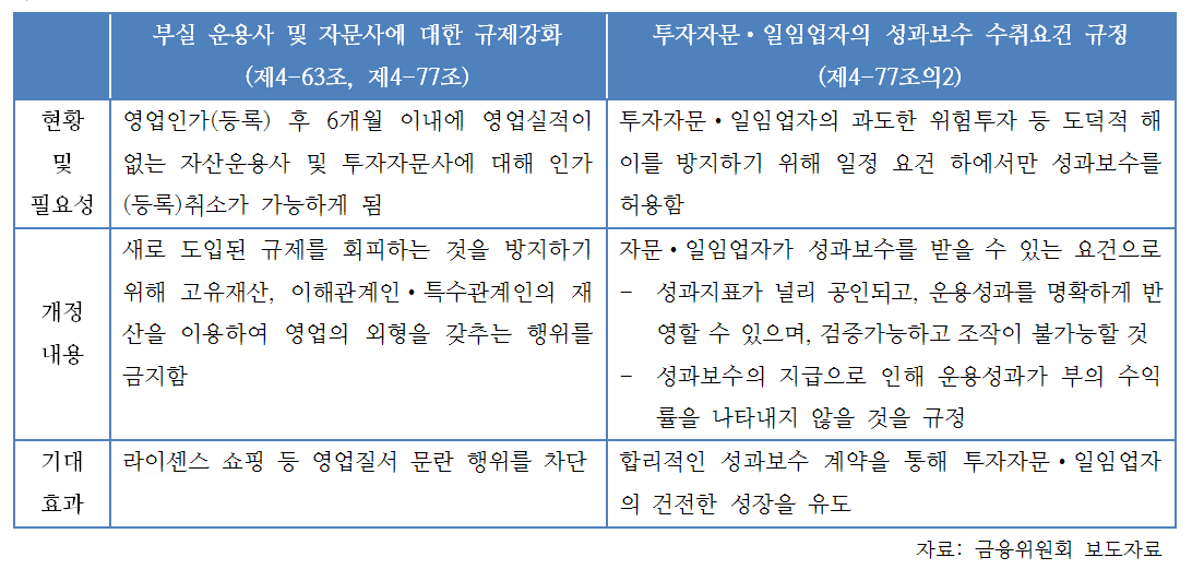 이처럼 손실을 보는 자문사가 늘어나며 재무건전성 부실이 우려되자 금융위원회는 지난 9월, 개정 자본시장법(8월 시행) 관련 5개 하위 규정에 대하여 일부 개정규정안을 의결했다. 이 중에는 투자자문사에 대한 내용이 포함되어 있다.