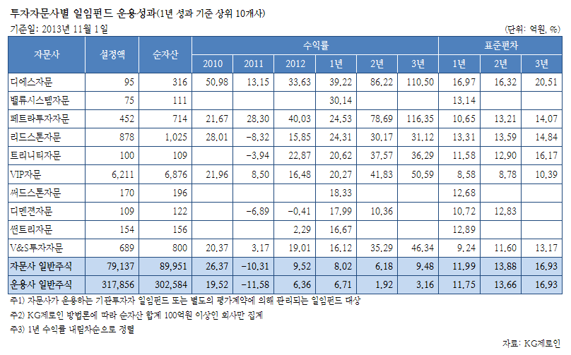 투자자문사의 일임펀드는 고객과의 1:1 계약에 의한 개인계좌이므로 그 운용결과는 투자자 본인 이외에는 공개되지 않는다. 펀드평가사 KG제로인은 자문사와의 평가계약을 통해 2006년부터 투자자문사 일임펀드의 그룹수익률을 산출해왔다. 공사모펀드 주식형 펀드와의 비교를 위해 설정액 10억원 이상이며, 분산투자를 하는 일임펀드를 대상으로 KG제로인 평가방법론을 따르고 있다. 따라서 아래에 언급하는 자문사 성과는 업계의 모든 회사나 펀드를 대상으로 한 것은 아니며, 일반 개인투자자가 기대할 수 있는 일임펀드 성과와는 다소 차이가 있으므로 자문사 성과만으로 투자 의사 결정을 내리는 것은 위험하다.