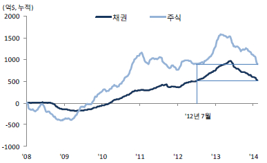 국내 금융시장도 테이퍼링 이슈가 붉어질 때마다 요동쳤으며, 국내 펀드시장에서도 신흥국에서 선진국시장으로의 자금이탈이 두드러졌다. 2013년 한해 동안 미국, 영국, 룩셈부르크 등에 투자하는 해외투자펀드는 각각 4.3조원, 1.2조원, 0.3조원 증가한 반면, 중국, 브라질, 인도에 투자하는 해외투자펀드는 1.7조원, 1.1조원. 0.4조원 감소하였다. 또한, 인도, 인도네시아, 브라질, 터키 등 위기 신흥국에 대한 익스포저도 12년말 4.7조원에서 2.7조원으로 무려 42.8% 급감하였다.