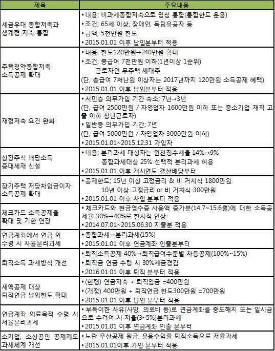신용카드를 주로 사용하는 직장인이라면 반가울 소식도 있다. 폐지될 예정이던 신용카드 소득공제 적용이 2016년 연말까지 2년 연장됐다. 또 소비심리 개선을 목적으로 지난해 7월부터 올해 6월까지 1년 동안 본인의 체크카드와 현금영수증 사용 실적에 한해 한시적으로 30%에서 40%로 소득공제율이 인상된다.