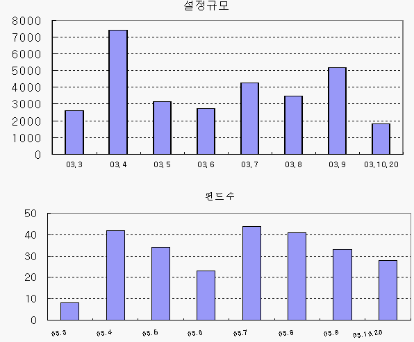 □ 월별 설정추이는 03.3월 최초 설정된 이후 4월 7,404억으로 설정규모가 가장 컸으며, 3월을 제외하면 6월 설정규모가 가장 작았음